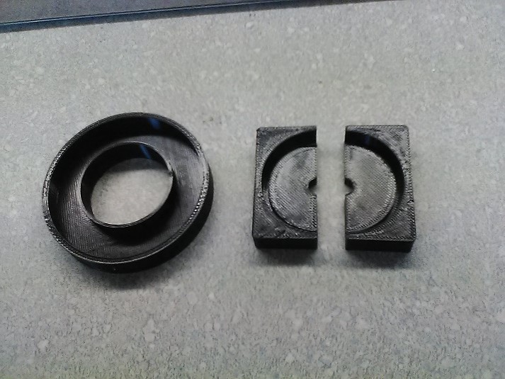 3D printed epoxy mold pieces. On the left is the cover for the top of the KF 40 fitting to keep it free from epoxy. On the right are the pieces that clamp around the cable and form the bottom of the epoxy mold.