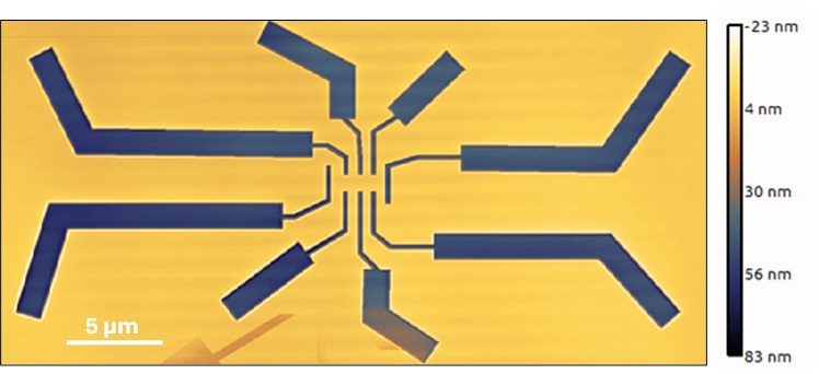 High-resolution written pattern on PPA/PMMA-MA layers using NanoFrazor t-SPL, showcasing precise electrode design with sub-micron features. The color scale indicates pattern depth in nanometers.