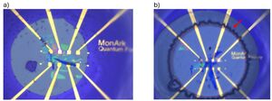 Figure 4. Stamp in contact with electrode substrate during final deposition. b) PC melting off the stamp with a circular front of PC collapsing toward center, denoted by red dotted circle. Notable feature is the finger-like channels indicated by the red arrow. Note image in b) is a different heterostructure.